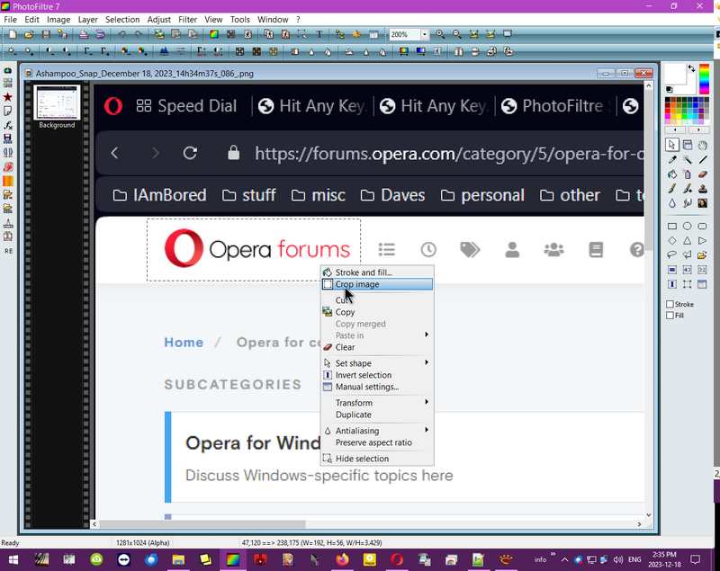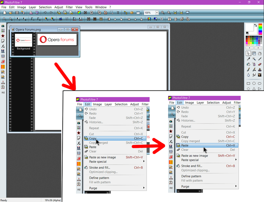 In my example here I'm using the logo from “Opera Forums”. It is on top of the white background one. I click on “Edit” then “Copy”. Then I click on the white background image to make it active and click on “Edit” and “Paste”.