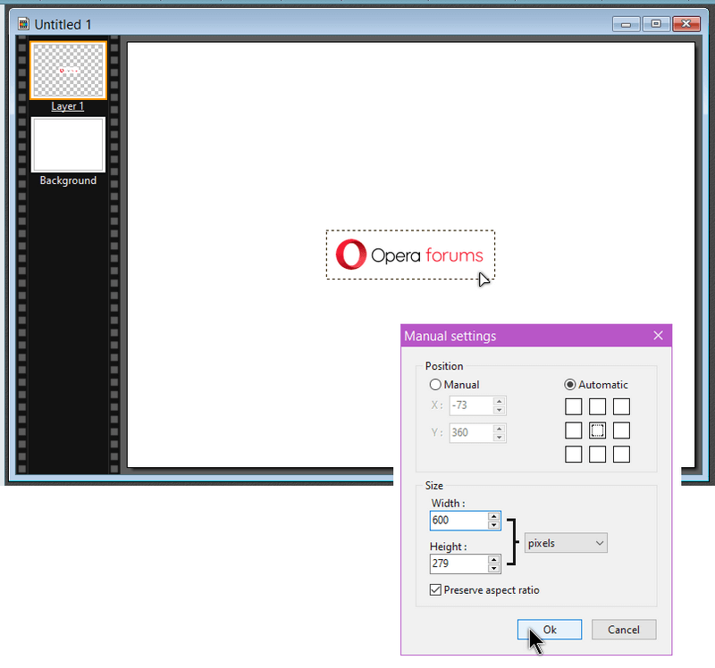 Here you can adjust the size of the “Opera Forums” logo. I set the “Width” at 600 pixels. The Height will automatic adjust if you keep the “Preserve aspect ratio” is checked. Click on “OK”