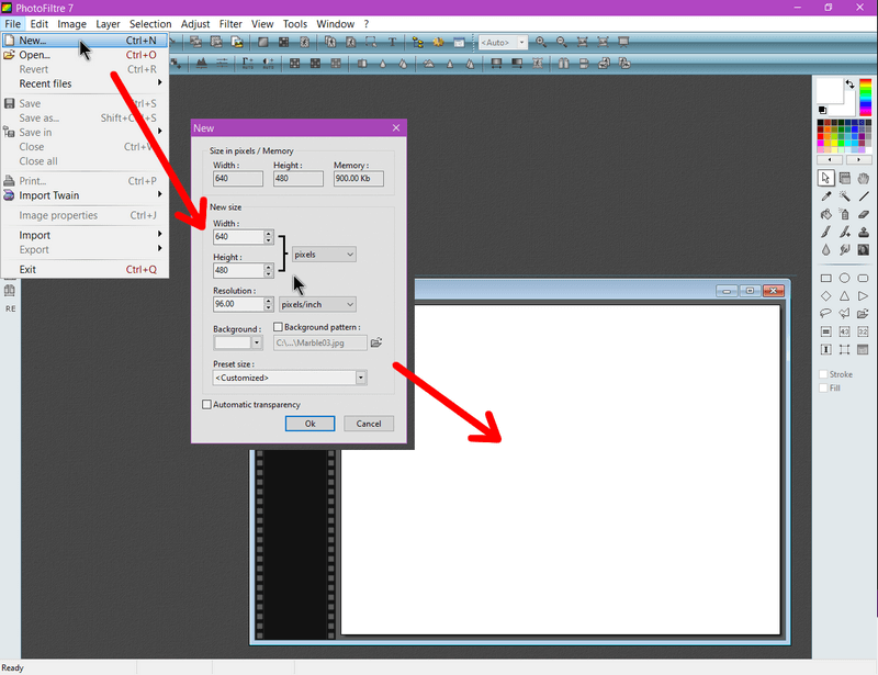 Now in Photofiltre I click on “New” and in the box that opens I type in the size I want. In my case 640x480. This creates a new blank image to work with.