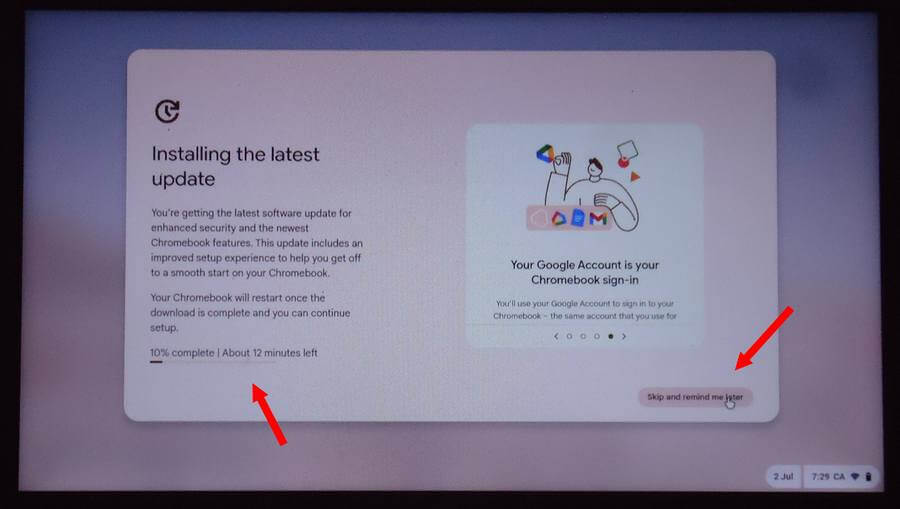 Then it starts Installing the latest Updates. It doesn't always appear right away but you'll eventually get an option to Skip and remind me later. Your choice. I just let the updates run first.