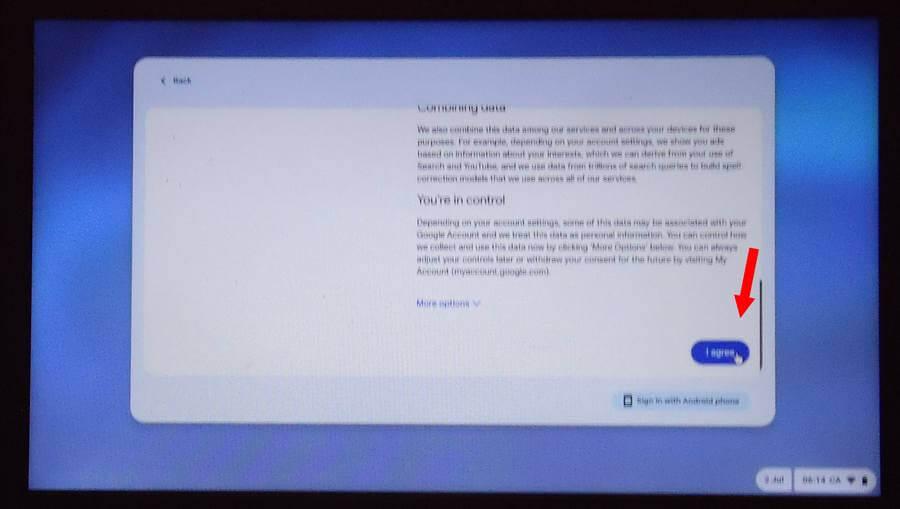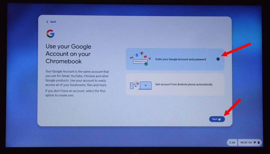 On the next screen after the reboot, Use your Google Account on your Chromebook, I selected Enter your Google Account and password.