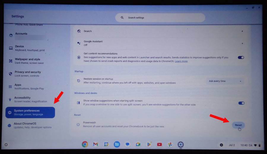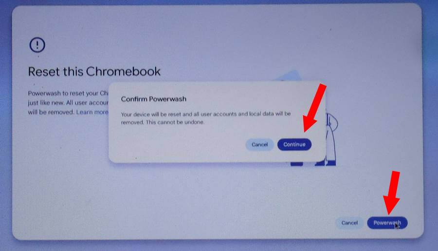 Hold until the Reset this Chromebook screen appears and then click on the Powerwash button.