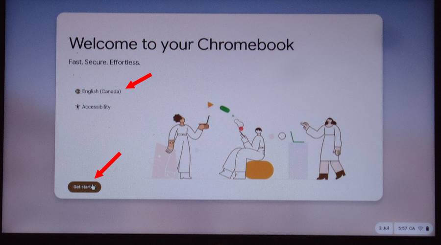 Then comes the first setup screen, Welcome to your Chromebook. Where it says English (Canada), click on that to change to your preferred language. Otherwise click Get started.